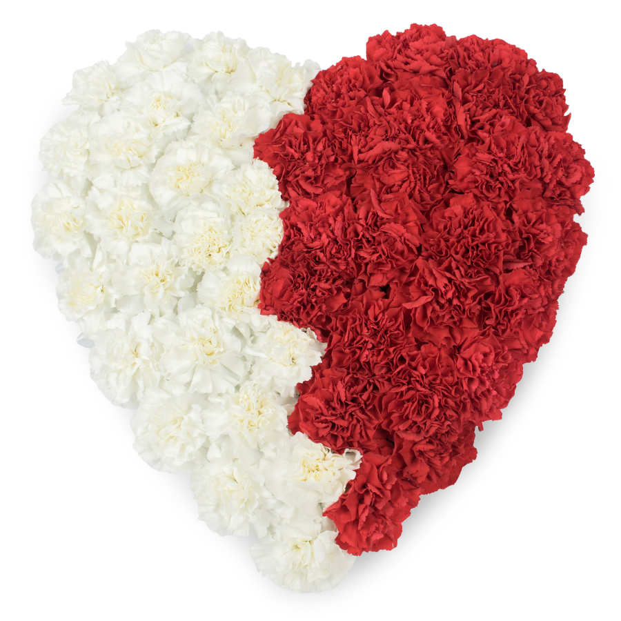 Discover the Pure Heart Carnation Arrangement, an elegant creation by Handy Flowers. This bouquet features a beautiful blend of white and red carnations, thoughtfully arranged into a heart shape to express pure love and sympathy.